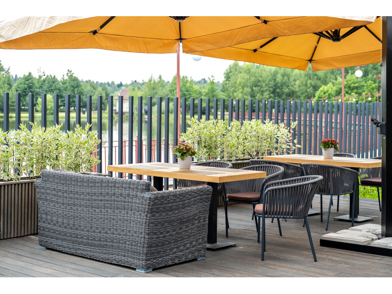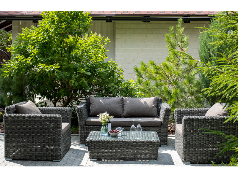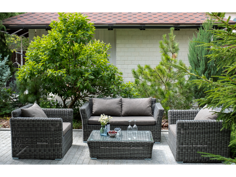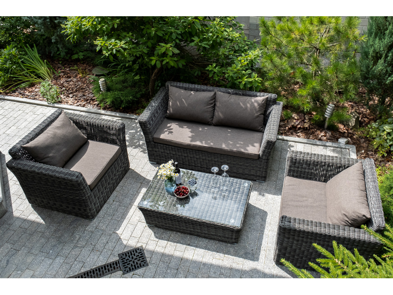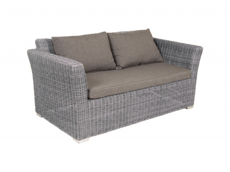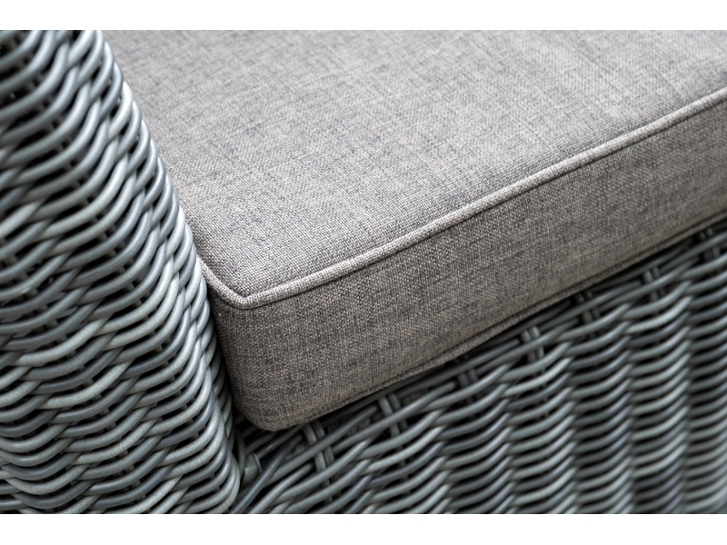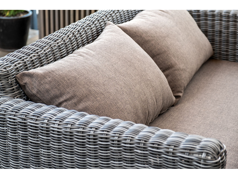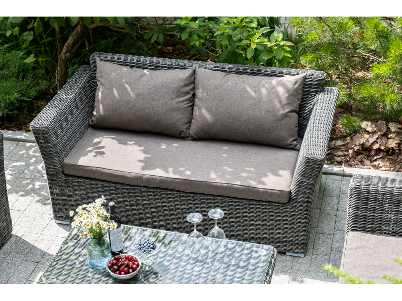 Диван «Капучино» двухместный с каркасом из прочного алюминия. Размер модели – 1700×865×815 мм. Диван выполнен из круглого искусственного ротанга графитового цвета, оплетенного вручную. Двухместный диван дополнен несколькими подушками со съёмными серо-коричневыми чехлами. Они изготовлены из прочного полиэстера, плотность которого достигает 230гр/м2. Предусмотрена влагоотталкивающая пропитка ткани для защиты текстильных изделий от намокания.