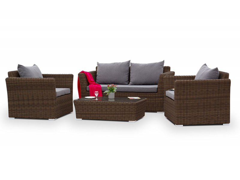 Диван «Капучино» подходит для удобного размещения двух персон. Он имеет алюминиевый каркас, который выдерживает высокие нагрузки. Размер модели – 1700×865×815 мм. Диван выполнен из искусственного ротанга натурального коричневого цвета с помощью ручного круглого плетения. Укомплектован двухместный диван подушками со съёмными чехлами. Они пошиты из прочного полиэстера серо-коричневого цвета с плотностью 230гр/м2. Материал обеспечивает защиту текстильным изделиям, которая усиливается за счет влагоотталкивающей пропитки ткани.