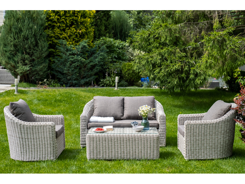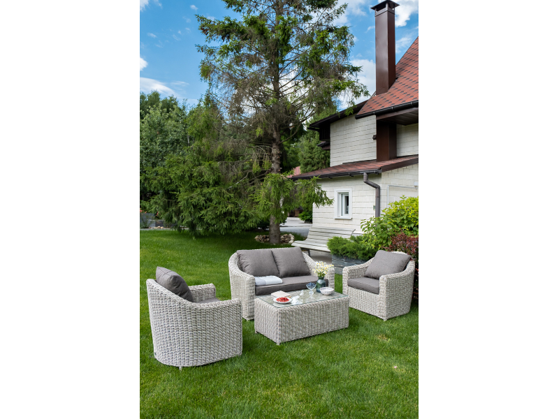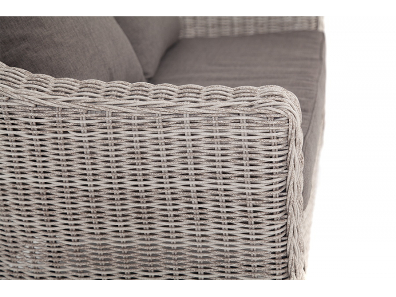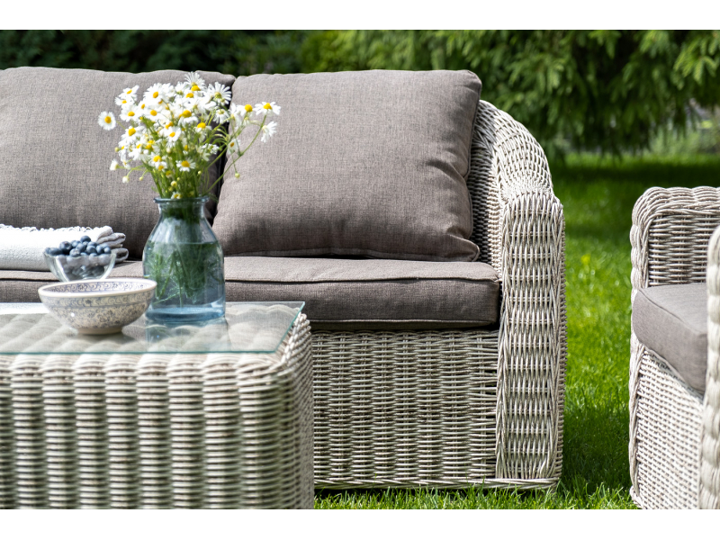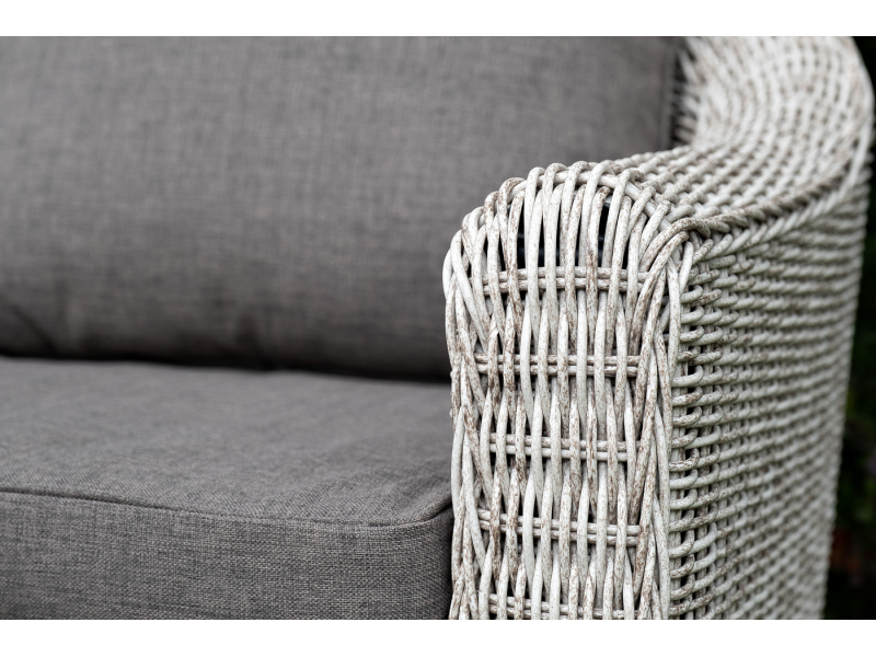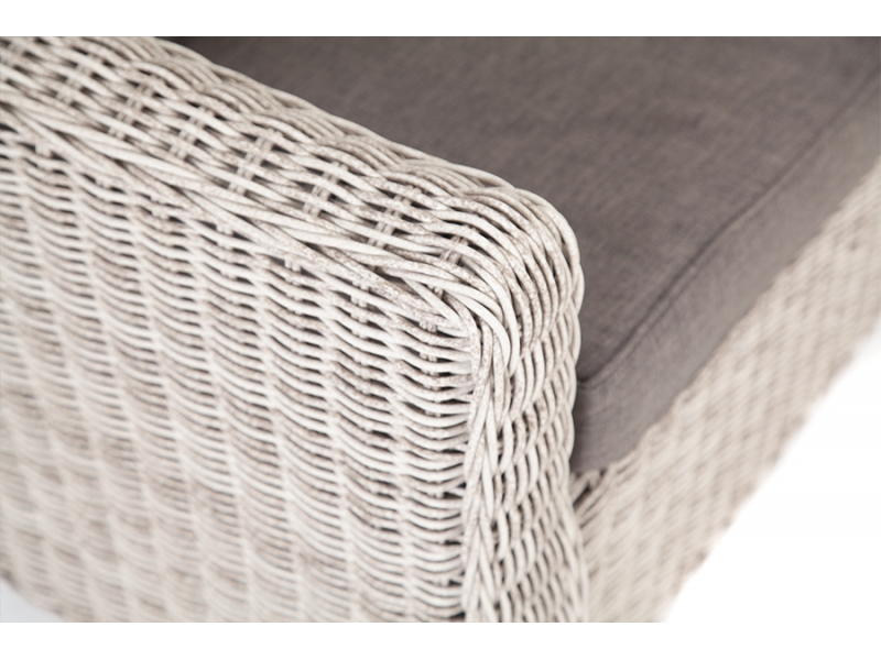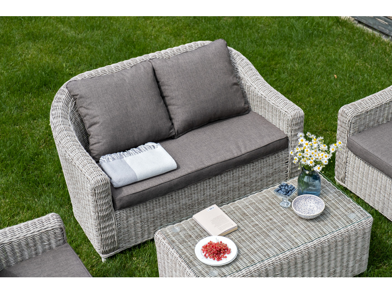 Диван из искусственного ротанга бежевого цвета «Кон Панна» дает возможность комфортно расположить две персоны благодаря комплектным подушкам из полиэстера с влагоотталкивающей пропиткой. При производстве садового дивана был использован прочный алюминиевый каркас, который оплетен вручную круглым искусственным ротангом. Габариты: 1370×800×800 мм.