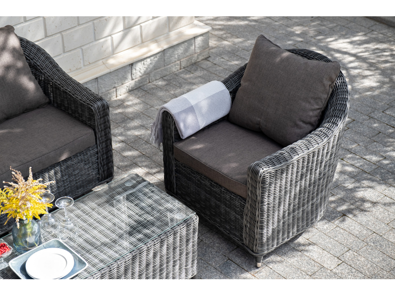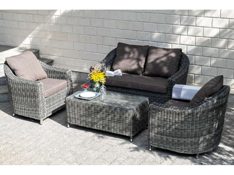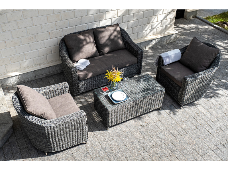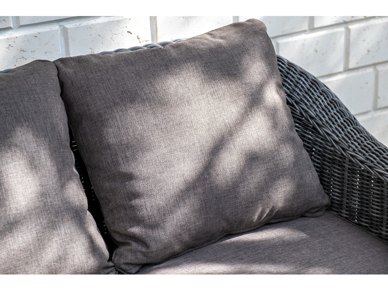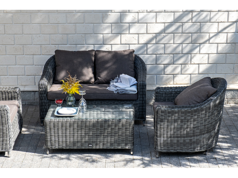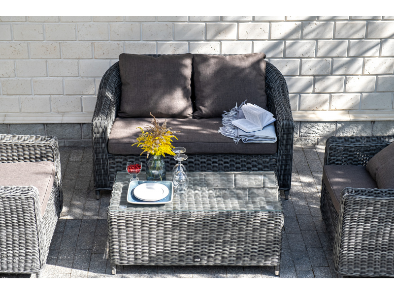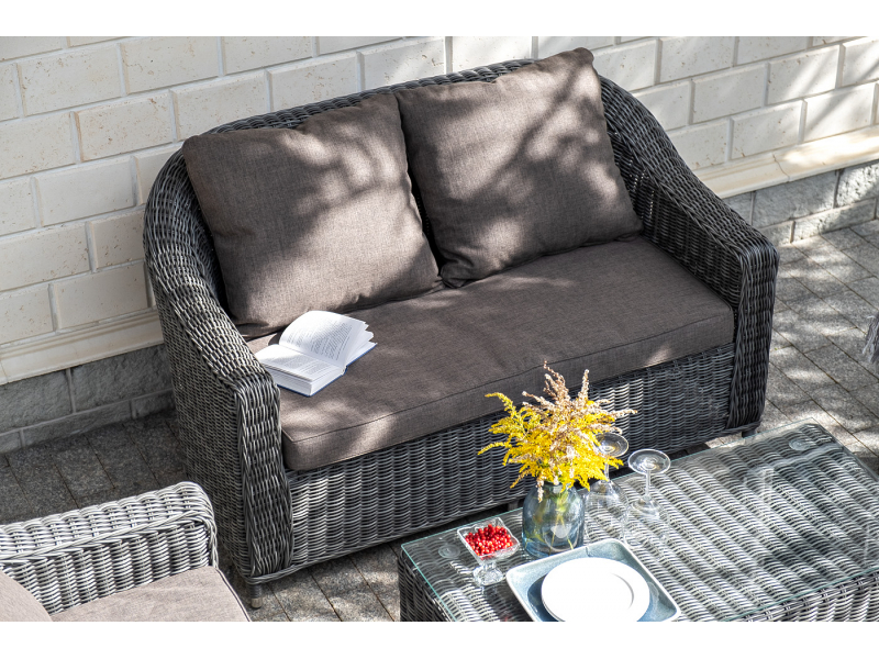 Диван из искусственного ротанга графитового цвета «Кон Панна» дает возможность комфортно расположить две персоны благодаря комплектным подушкам из полиэстера с влагоотталкивающей пропиткой. При производстве садового дивана был использован прочный алюминиевый каркас, который вручную оплетен круглым искусственным ротангом. Габариты: 1370×800×800 мм.