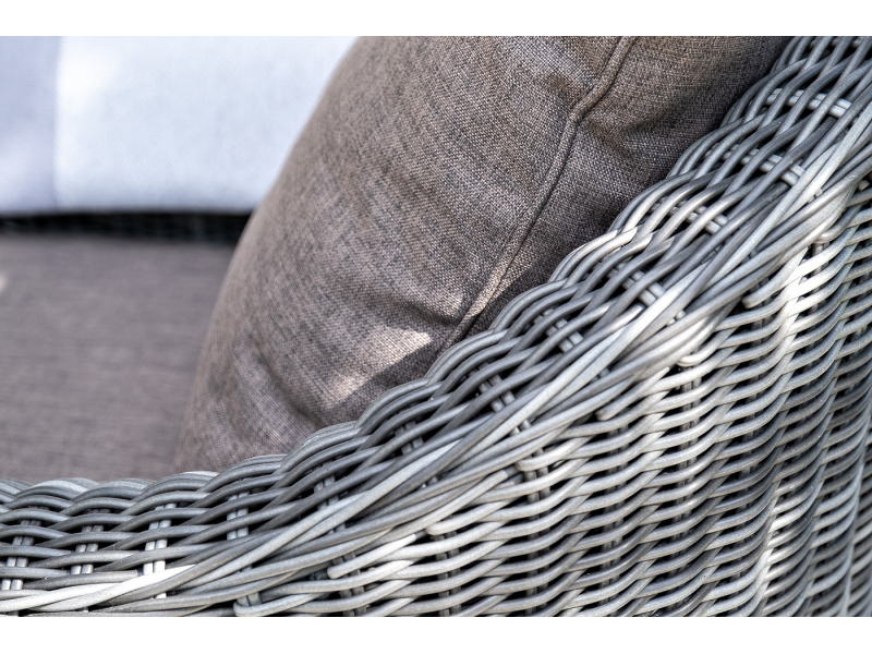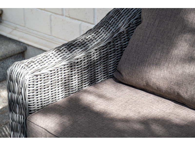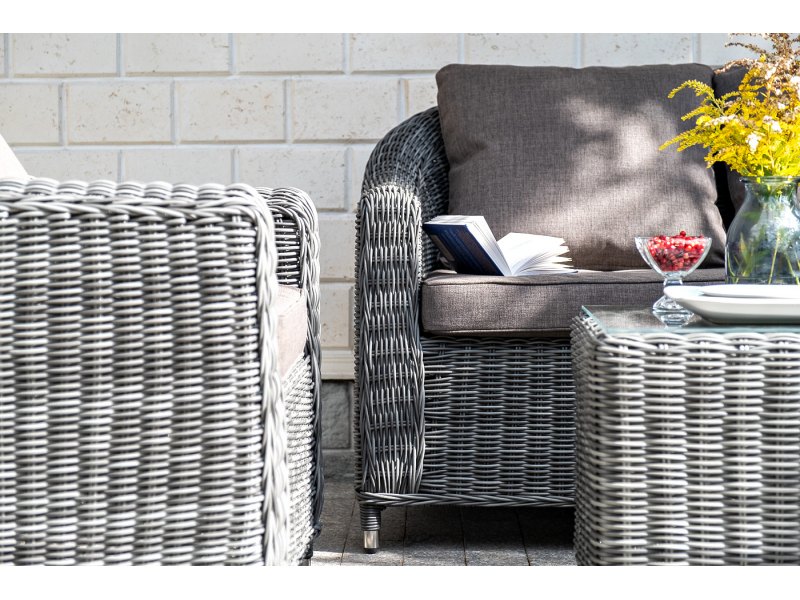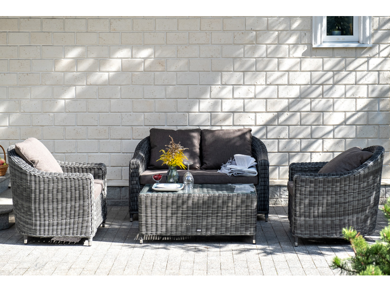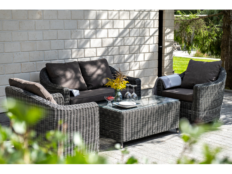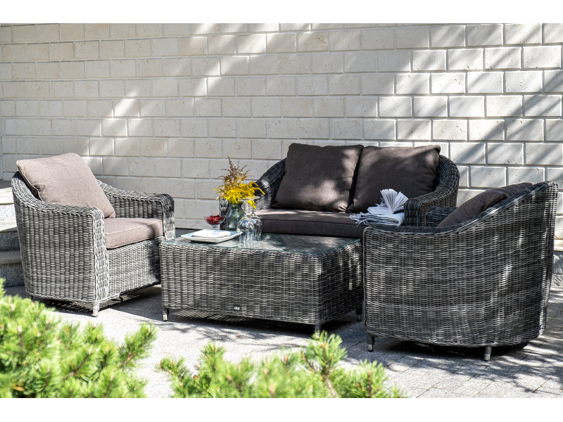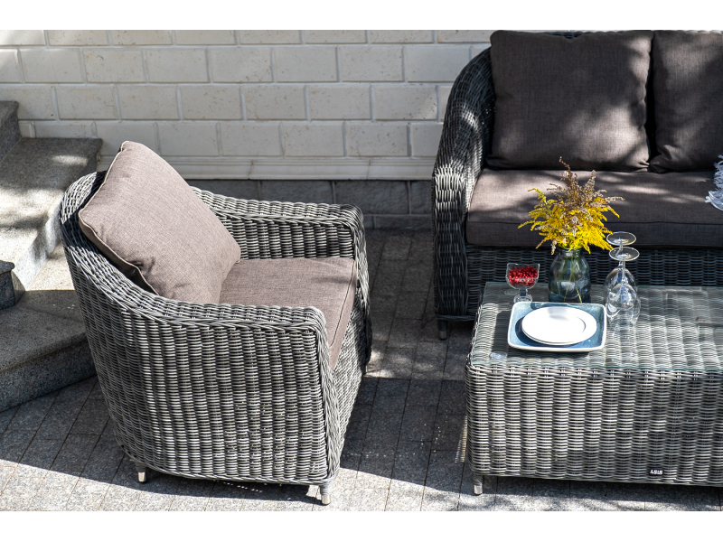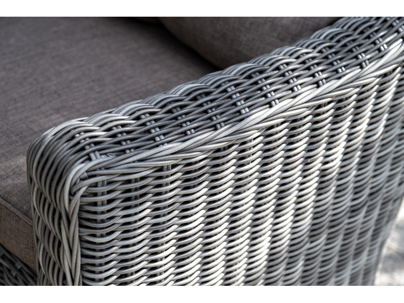 Диван из искусственного ротанга графитового цвета «Кон Панна» дает возможность комфортно расположить две персоны благодаря комплектным подушкам из полиэстера с влагоотталкивающей пропиткой. При производстве садового дивана был использован прочный алюминиевый каркас, который вручную оплетен круглым искусственным ротангом. Габариты: 1370×800×800 мм.