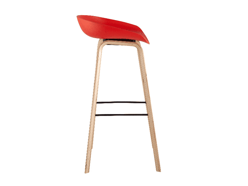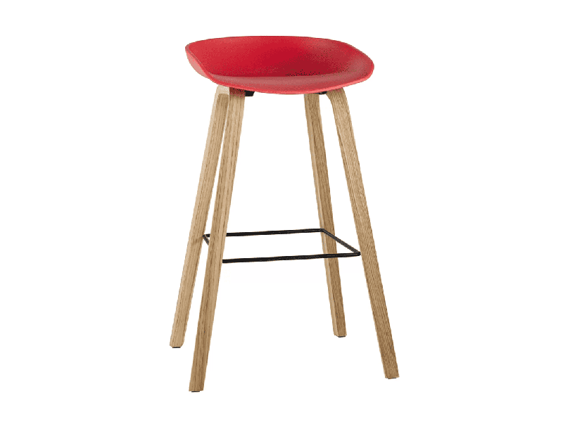 В дизайне модели «Либра» используется сочетание красного пластика и естественного оттенка натурального дерева – опоясывающая ножки опорная планка в тон сиденью уравновешивает цветовую комбинацию и подчеркивает модные геометрические формы барного стула. Высота соответствует стойке стандартной высоты.