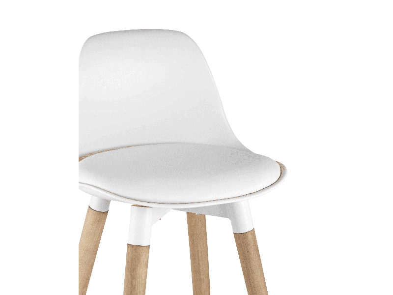 Для стула «Мартин» использовано несколько материалов. Сиденье обтянуто износостойкой PU-кожей молочно-белого цвета, ножки каркаса выполнены из натурального светлого дерева, а опорная планка-подножка основания в форме кольца – из хромированного металла. Модель поставляется в разобранном виде в картонной фабричной упаковке.